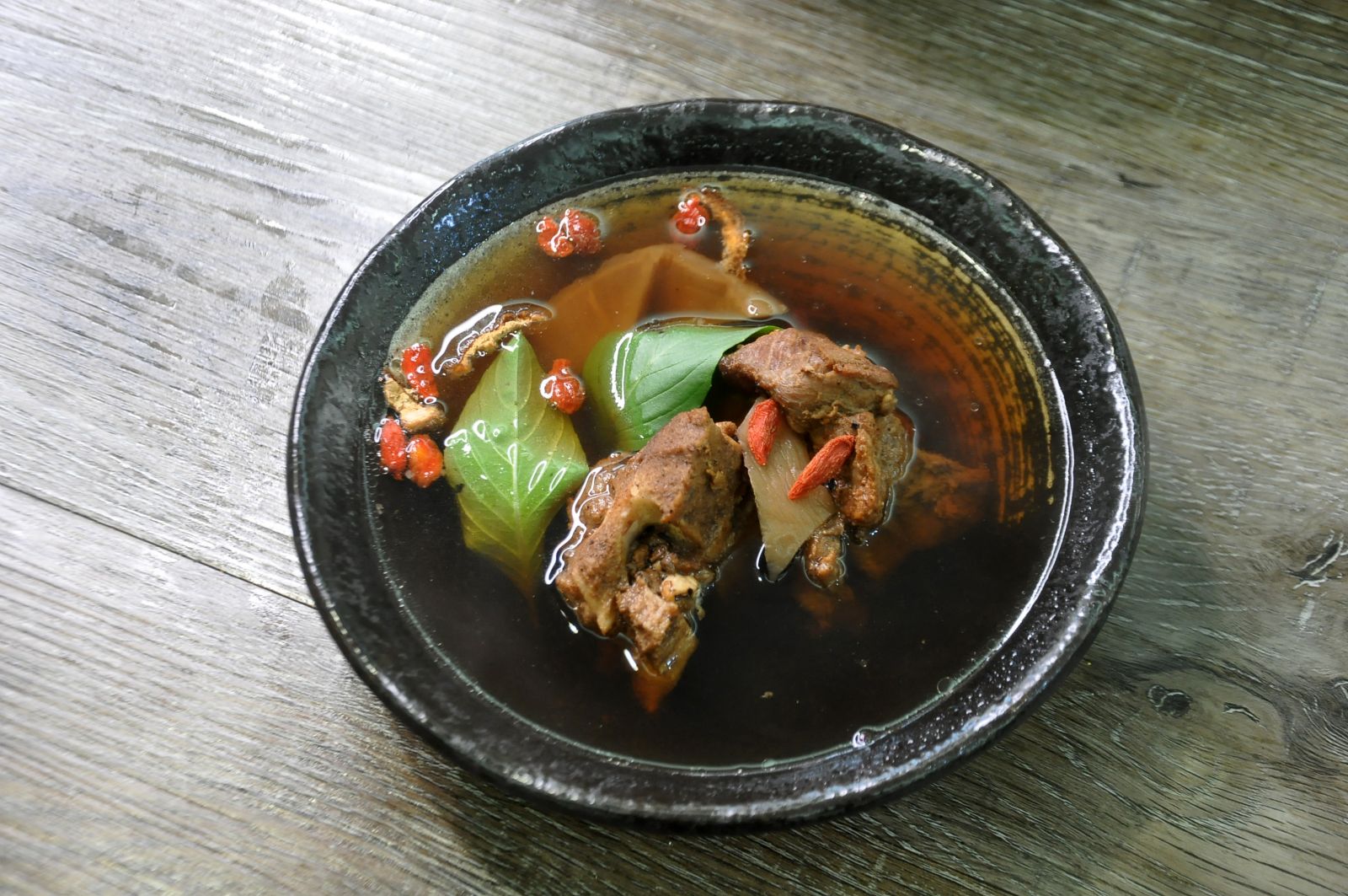 薑母鴨鮮蟹鍋運用一獨特客家元素就是客家紅糟,紅糟的酒香與鮮蟹融合,薑母經麻油爆到金褐後,香氣濃郁不嗆。要學紅糟如何去生味技巧、海蟹與薑母鴨的時間差控制