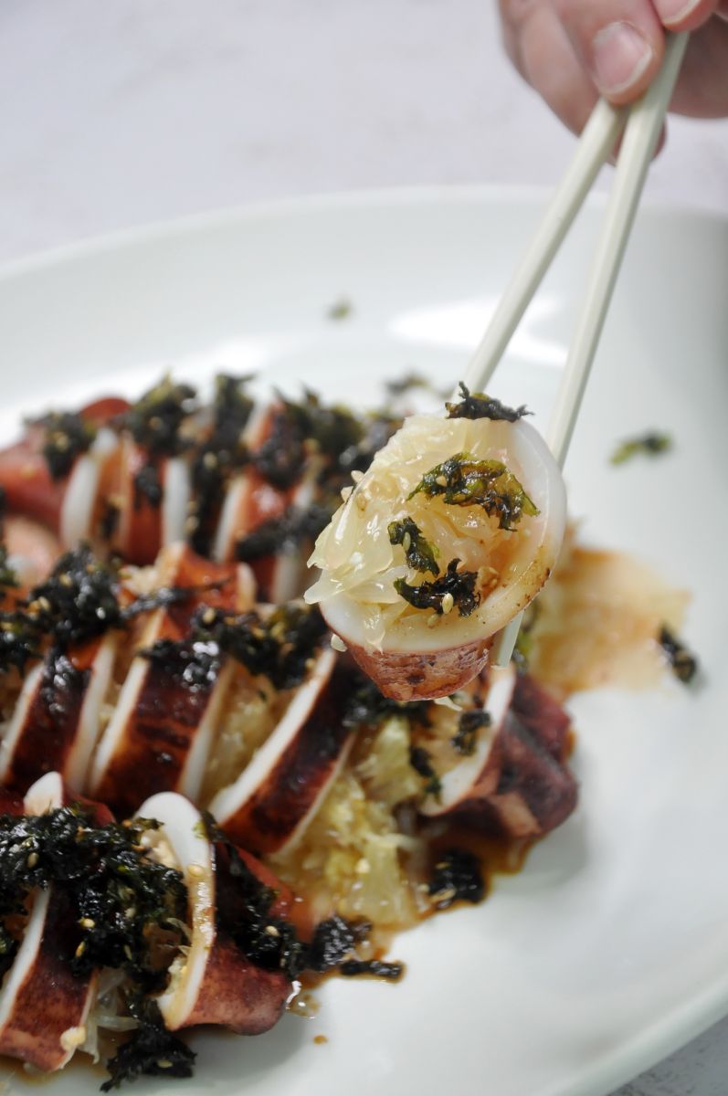 客家清香三彩蔬海拼盤是青花菜、紫山藥、南瓜三種食蔬,搭配瓜子、薑母鴨鮮蟹鍋花枝,以微酸的客家桔香調和海味,成為冬天爽口不膩的溫熱料理。要學海鮮不同熟度的掌握、桔醬與蒜油的完美比例、蔬菜三色如何保持鮮亮、非湯料理也能保留鮮味的技巧。