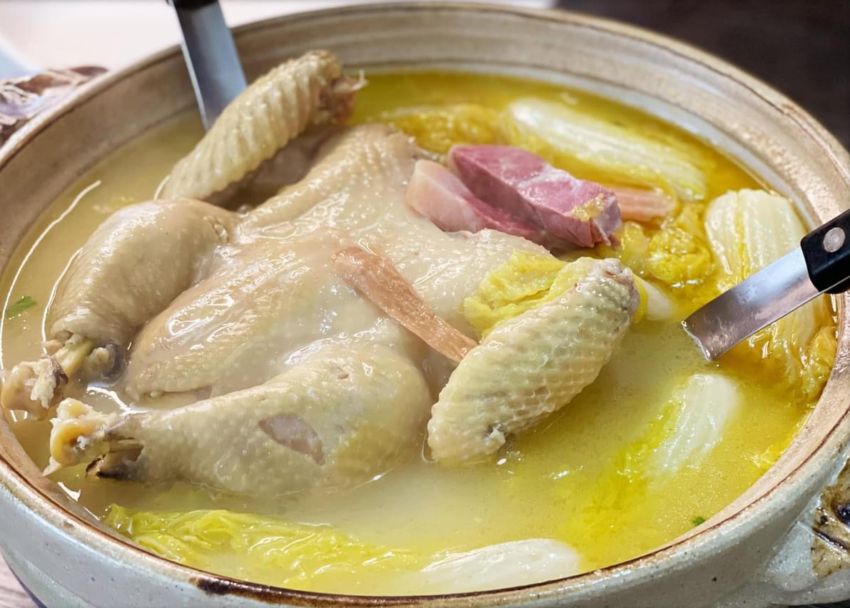 一品富貴鍋,用老師招牌的濃白湯燉煮全雞、火朣和豬前腿,還有扁尖干貝等佐料,以大火和中文火分層經常長時間熬煮,將食材本身的精髓表現出來,最後加上芽白菜,味道濃厚鮮美,這鍋湯可以不斷加料,從除夕吃到初三喔。