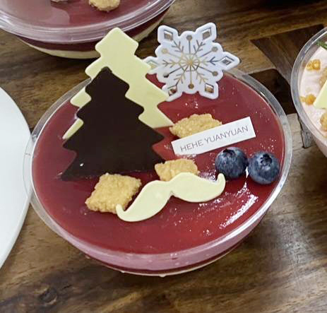 冬之森林聖誕杯是以卡士達餡,搭配法國鮮奶油,混合卡士達醬的濃郁和鮮奶油的輕盈,口感介於兩者之間,更加綿密細緻的外交官奶油餡,絲滑清爽不膩,中間及表層皆有紅酒果凍再搭配覆盆子慕斯,紅色果凍的喜感是最佳耶誕甜點。