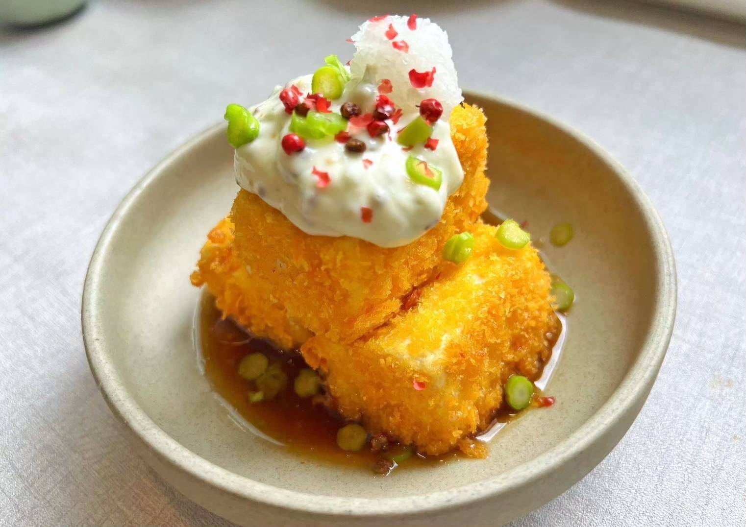 豆腐炸至金黃,搭配特製塔塔醬淋上天婦羅醬汁及蘿蔔泥,外酥內嫩,醬汁濃郁滑口。